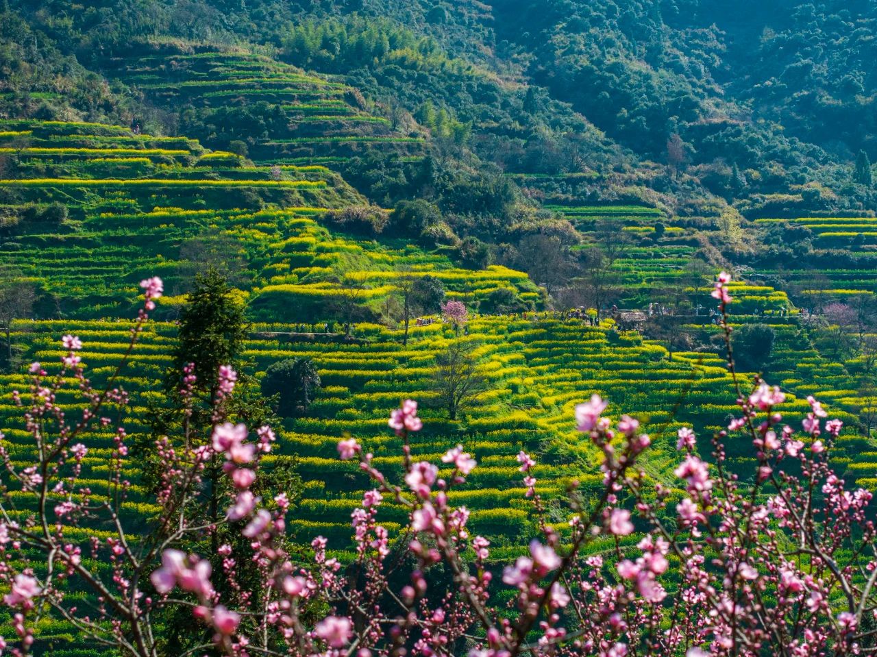 三月初開始,平原的第一片油菜花海成為篁嶺最耀眼的春日風(fēng)光;三月上旬,古村梯田花海、玉蘭花、梨花、桃花、海棠花陸續(xù)盛開,粉墻黛瓦的古村被百花環(huán)繞,與萬畝梯田花海相映成趣。