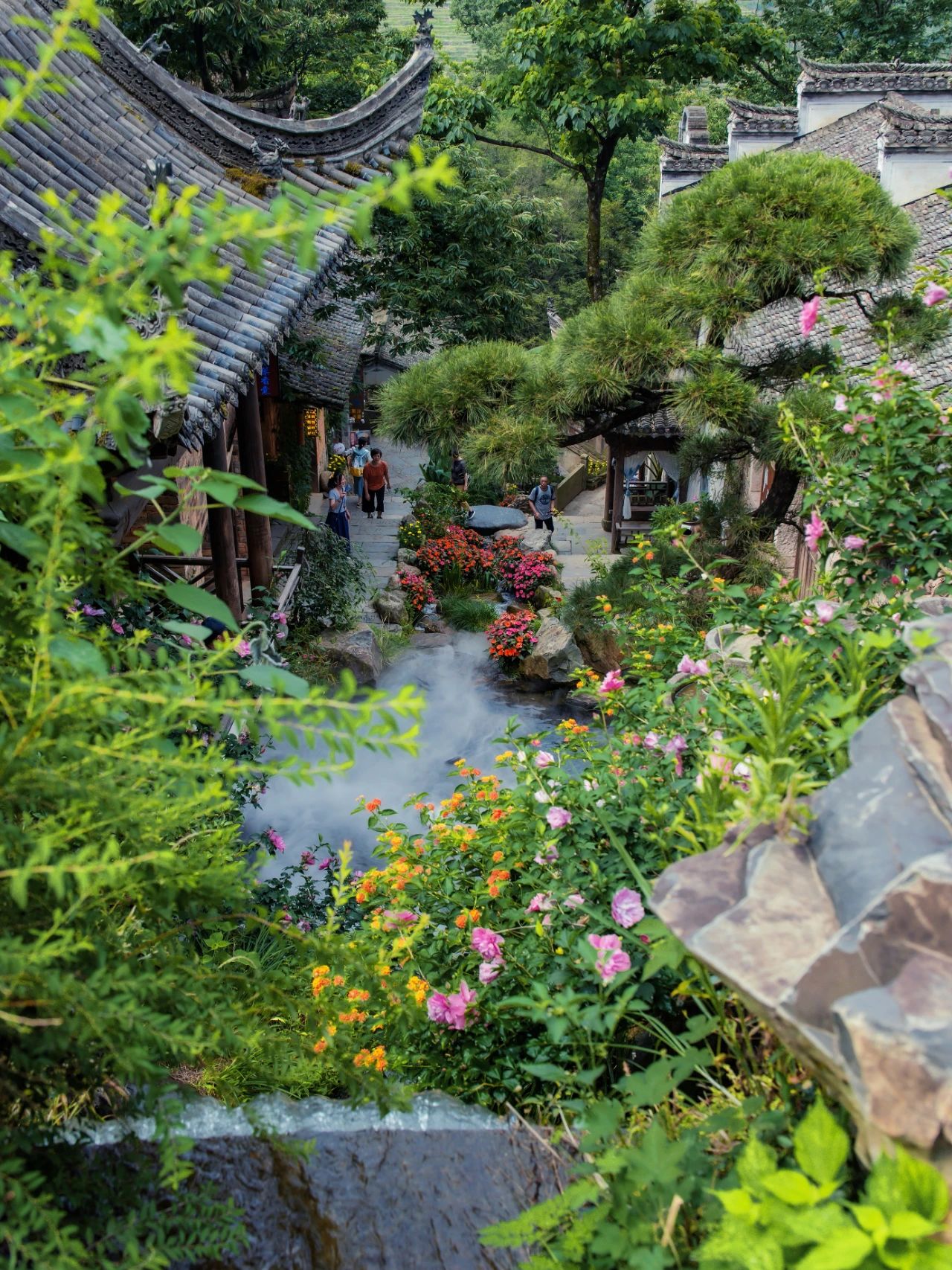 篁嶺的春天,古村巷陌間薔薇、繡球花、月季已熱烈綻放,白墻黛瓦被層層疊疊的花枝溫柔包裹,推窗即見花海。漫步天街古巷,春色與古民居交融成畫。別錯(cuò)過花溪水街,潺潺流水畔百花爭(zhēng)艷,每一步都是視覺盛宴。記得去古樹環(huán)抱的水口雨林里吸氧拍照,做一回林中仙子。