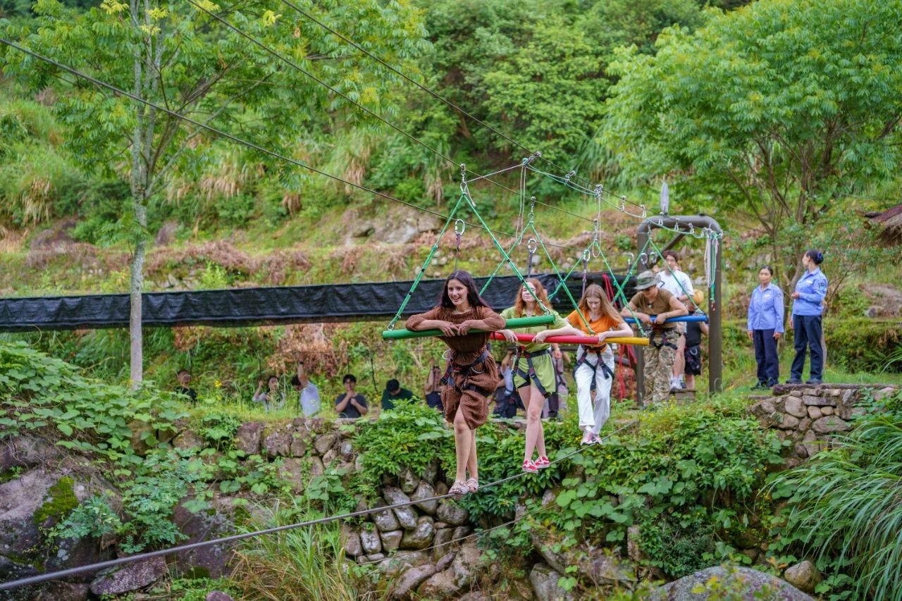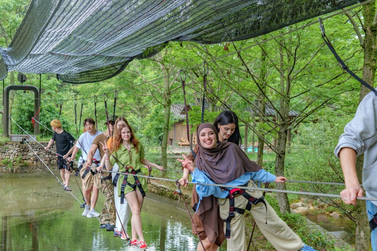 午后的體驗(yàn)項(xiàng)目成了勇氣與創(chuàng)意的試煉場。“英雄闖關(guān)”的叢林障礙間,各國達(dá)人相繼戴上安全繩,共同挑戰(zhàn)山野秘境中的各個(gè)關(guān)卡。