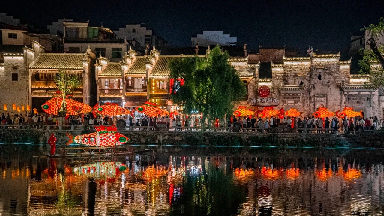 夜晚的高潮當(dāng)屬“星河漫巷”:魚燈隊(duì)伍如游鯉擺尾,檐角燈籠、湖面發(fā)光竹筏交織,點(diǎn)亮青石板路的千年夢境。古今交融,煙火氣十足!