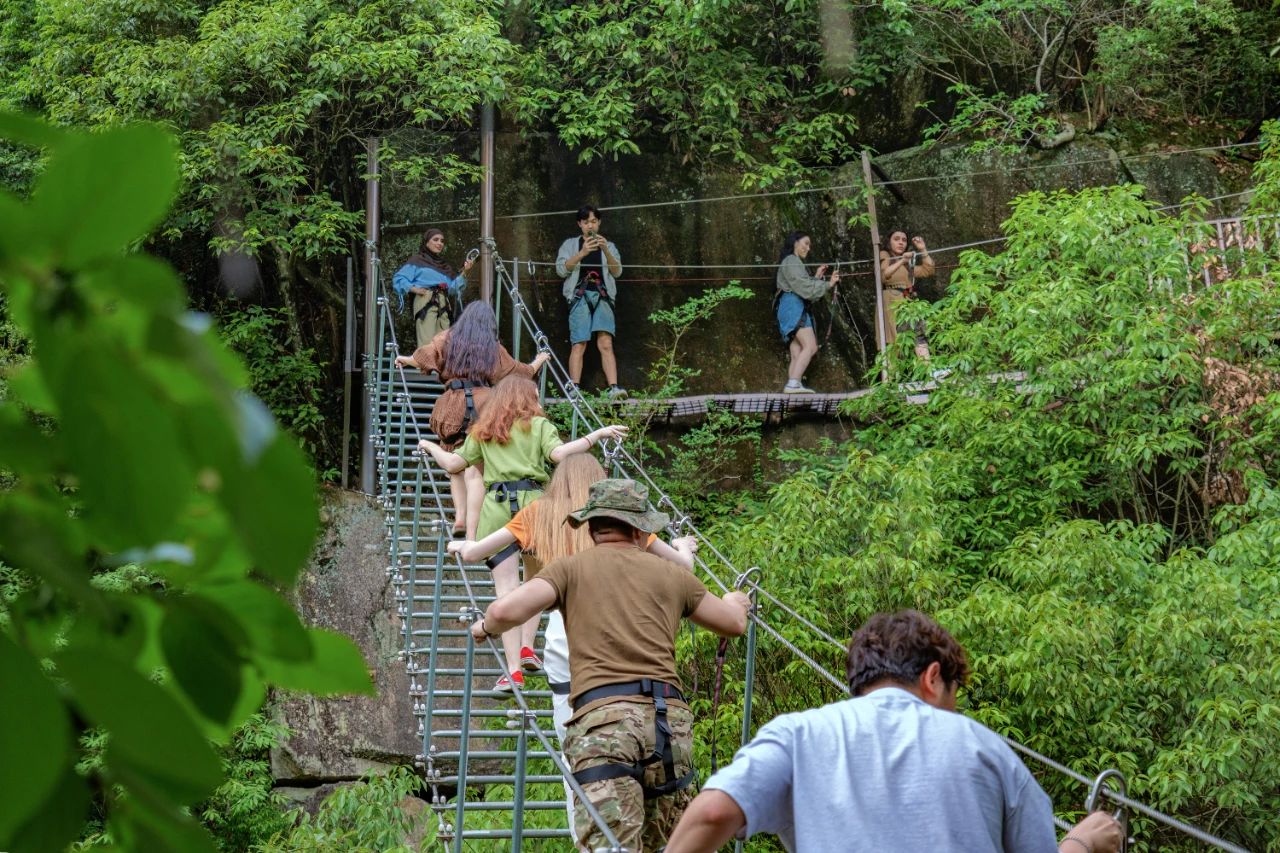 繩索階梯在山風(fēng)中輕晃,每一步都需專注發(fā)力。越往上攀爬,征服感越強(qiáng),登頂時(shí)俯瞰峽谷,成就感爆棚。