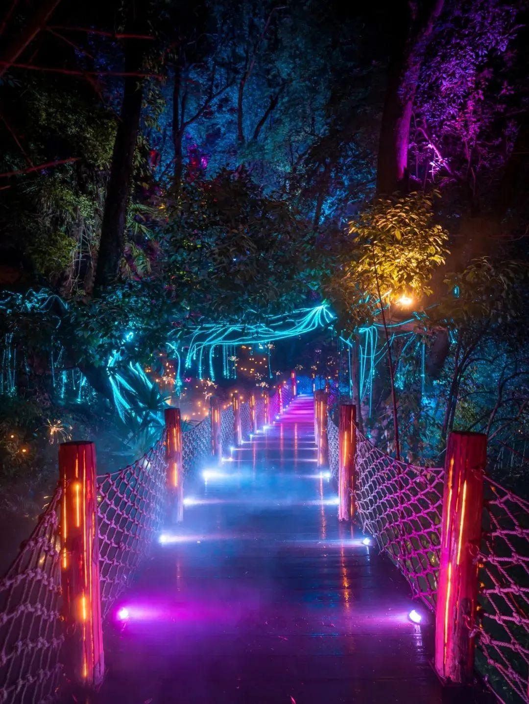 篁嶺水口雨林深處,藏一條通往幻夢的光影秘徑。邂逅《阿凡達(dá)》發(fā)光的生命之樹,藤脈如星河奔涌仰望《大魚海棠流光飛魚掠過頭頂,鱗片抖落一袖銀河。魔法屋外墻正上演篁嶺印象秀——曬秋椒紅、梯田金浪在光影中重組成超現(xiàn)實詩篇。走出這片流光森林,衣角還沾著未熄的星塵,此夜幻夢,已最難忘的記憶