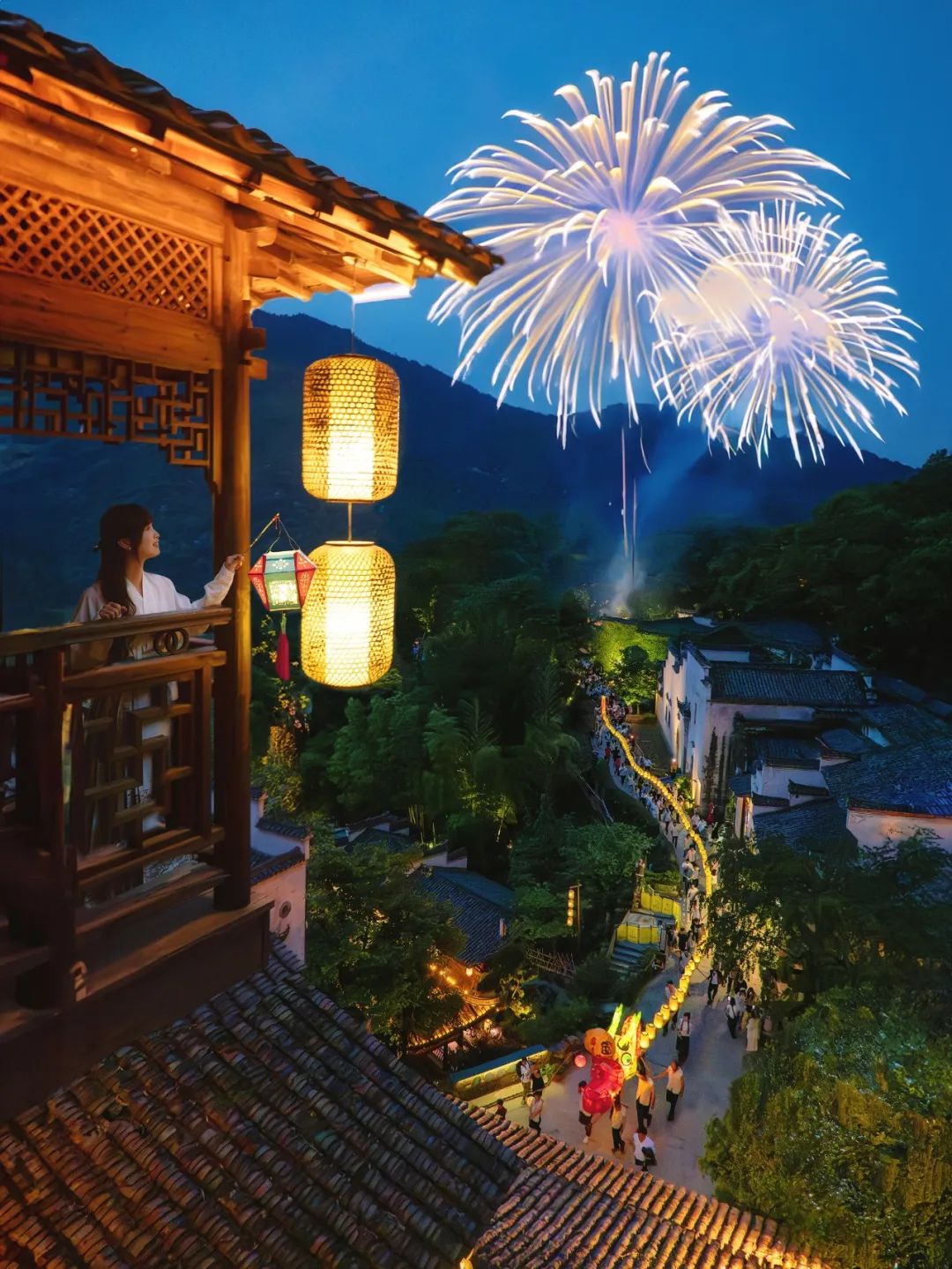 酒店接待中心四樓的觀景臺是一個隱蔽且小眾的打卡點,這里能最大限度的避開人群,獨享古村夜色,無論是吹風(fēng)納涼還是打卡拍照都十分適合。待到夏夜,板龍燈在村中穿梭飛舞,這里便成了最出片的觀賞地,你可以盡情俯瞰古村,靜賞舞龍盛景。