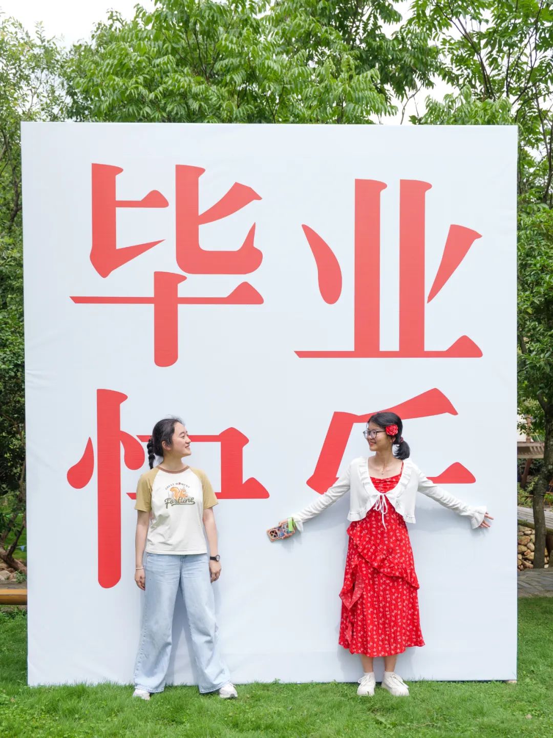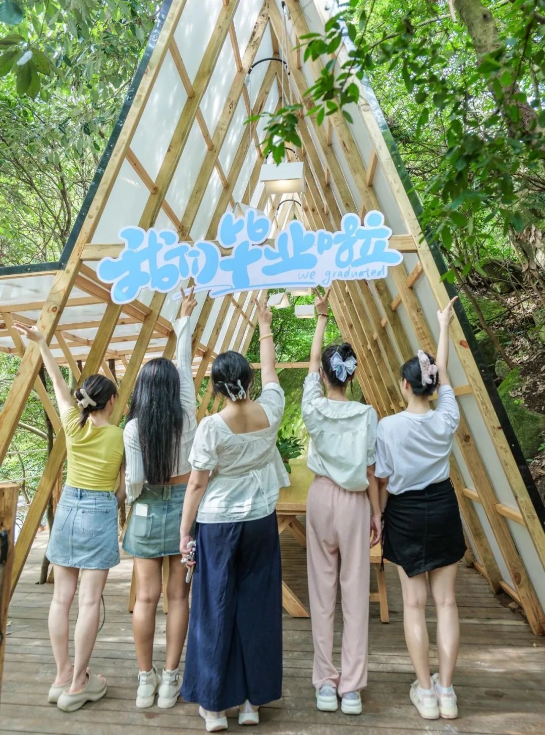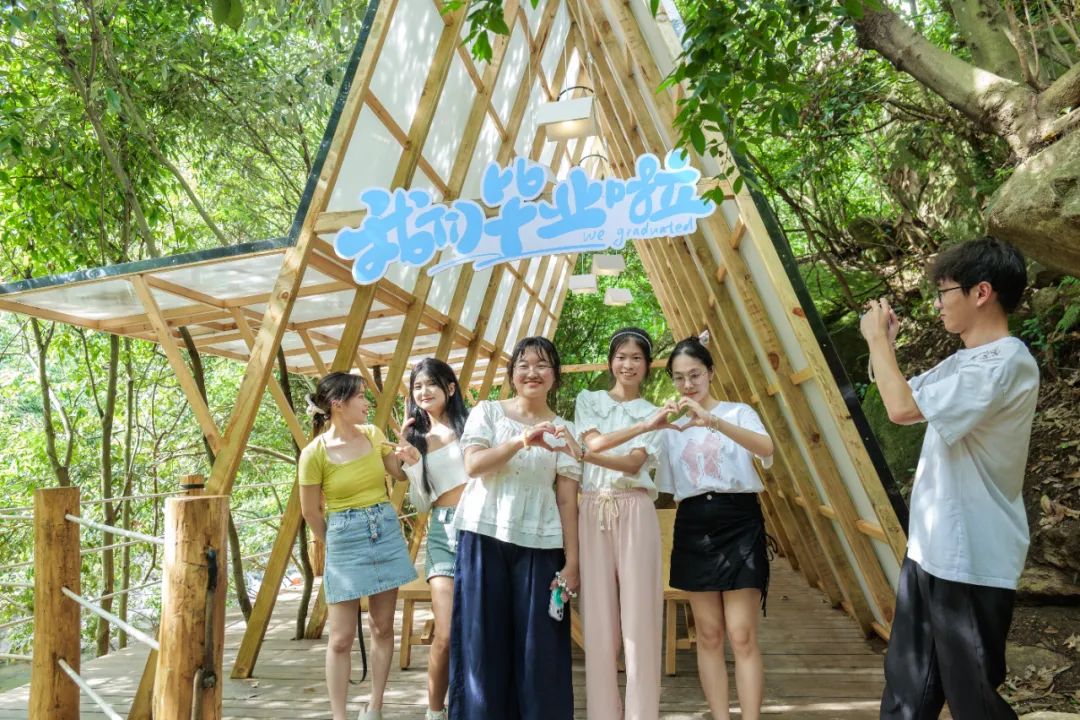 草坪上的涂鴉膜早已被各色筆跡填滿,繽紛的色彩就像少年們熱烈張揚(yáng)的青春。有人用紅色噴霧寫下我們畢業(yè)啦,有人畫下笑臉氣球與畢業(yè)帽,更有調(diào)皮的男生在打卡墻按下手印,笑稱 要把青春封印在石門峽。