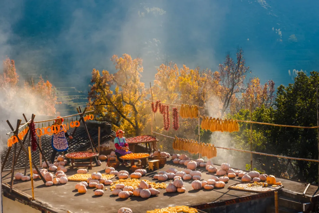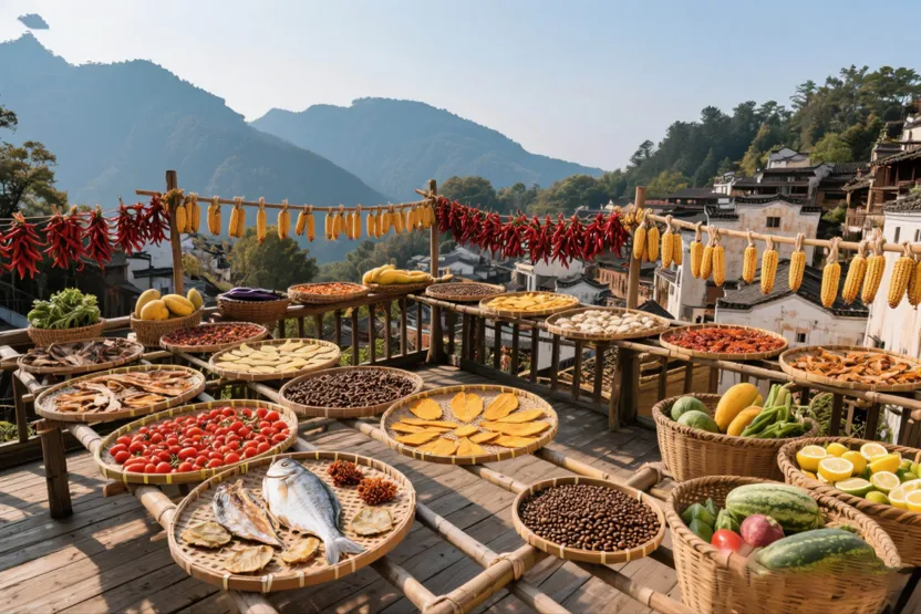 篁嶺的曬秋,始于山民與自然的博弈。因“地?zé)o三尺平”,先民架木為臺,將竹匾懸于窗欞屋檐,春曬竹筍蕨菜,夏曬干菜瓜茄,秋曬辣椒黃菊,冬曬果脯臘味——四季輪轉(zhuǎn)的“曬場”,本是生存智慧的無奈之舉。