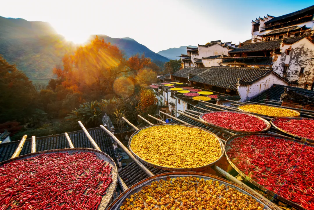 來篁嶺,曬秋必然是核心主角!作為曬秋文化的起源地,立秋之后,崖上古村便成了大自然與人文共繪的調(diào)色盤——紅的辣椒、金的玉米、黃的菊花……五彩作物在徽派古建的白墻黛瓦間鋪展,隨手一拍都是最美中國符號的鮮活畫面。