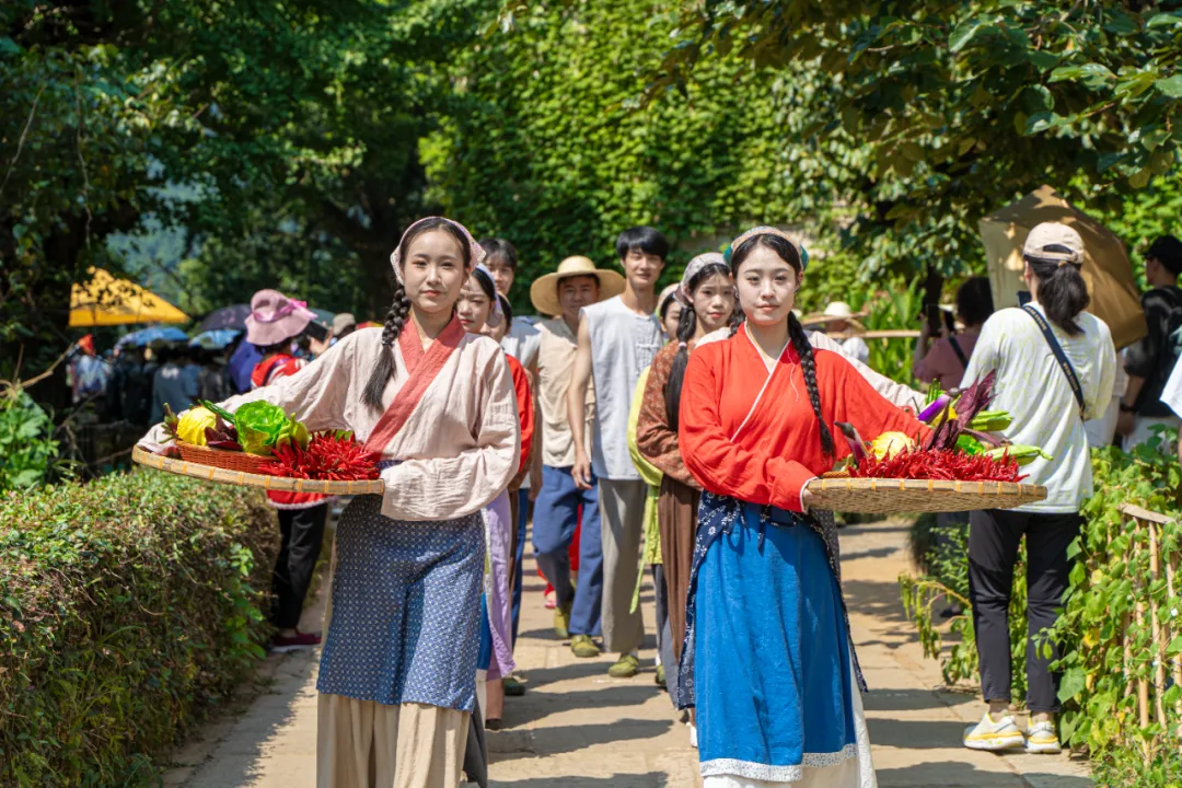 隊(duì)伍從五鳳亭出發(fā)時,鑼鼓聲便撞開了熱鬧的閘門——拖拉機(jī)上堆著圓滾滾的南瓜;曬娘的竹籃、挑夫的扁擔(dān)、果蔬模特的裙擺相映成趣。忽地,一隊(duì)金發(fā)碧眼的“國際曬秋隊(duì)員”舉著紅辣椒、捧著黃玉米,在篁嶺古村的曬臺上驚喜閃現(xiàn),這哪里是巡游?分明是一幅會呼吸的世界豐收長卷!