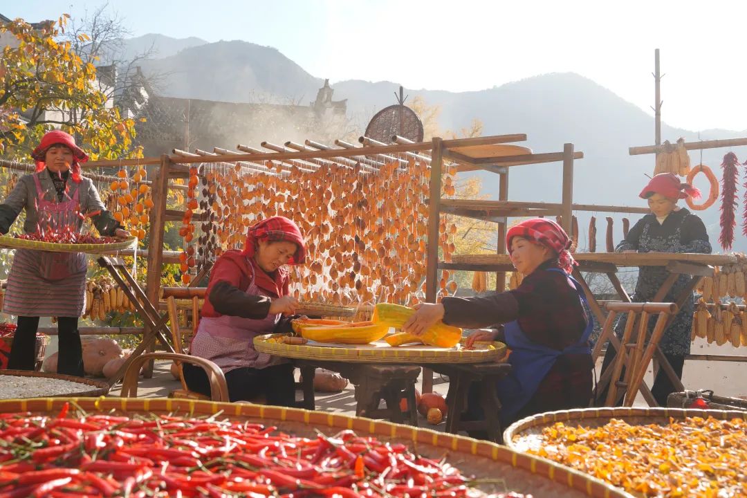 秋天,是篁嶺最富盛名的季節。獨特的“曬秋”民俗讓整個古村變成了一個巨大的調色盤——火紅的辣椒、金黃的玉米、橙紅的柿子……各種豐收的果實被盛放在竹匾里,晾曬在窗臺、屋頂上,繪就出一幅幅五彩斑斕的豐收圖景